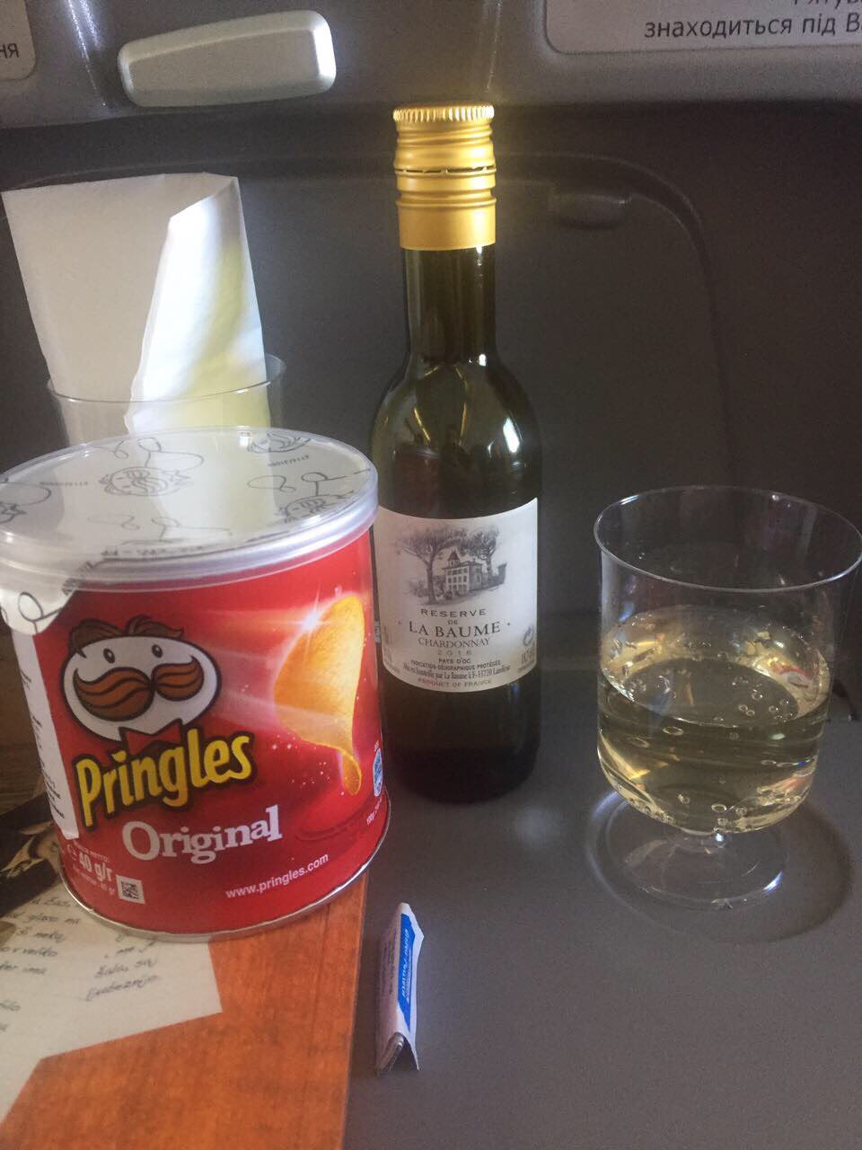 Ko so na letalu začeli ponujati pijačo, sem se odločila za flaško belega, ker so imeli akcijo, pa me je Boljša Polovica nagovorila, da vzamem še dve. Vedno zna preračunati. Ena gre z mano z letala, dve pa sta končali v meni, v odlični sinergiji z njeno mineralno z mehurčki.
